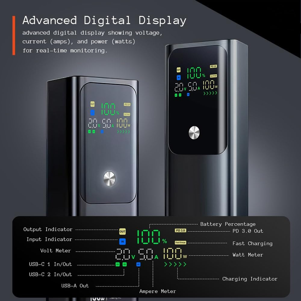 Real‑time readouts for battery percentage, voltage (V), current (A), and wattage (W) let you monitor exactly how much power you’re drawing—and when it’s time to recharge.